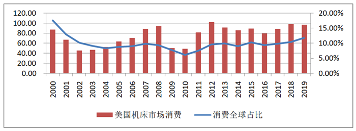 圖4 2000-2019年美國機床市場消費情況(億美元)