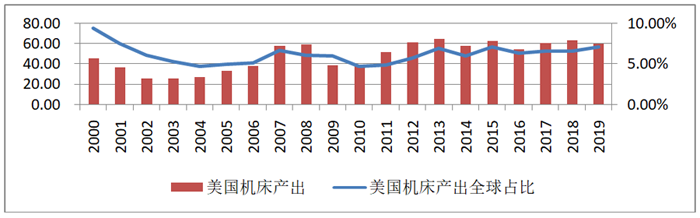 2000年,美國機床產出46.06億美元,占全球機床產出的9.42%;2010年,美國機床產出下降到37.92億美元,占全球機床產出的4.73%;2019年,美國機床產出60.02億美元,占全球機床產出的比例上升到7.13%。
