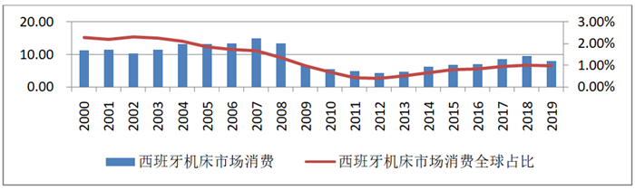 圖7 2000-2019年西班牙機床市場消費及全球占比(億美元)