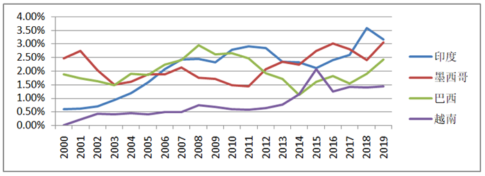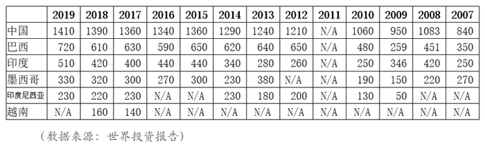 2007年以來,上述發展中國家外國直接投資總體呈現增加趨勢。其中,中國作為發展中國家吸收外國直接投資最大的國家,2012年之后,增長速度趨緩;印度吸收外國直接投資的增長速度最快;印度尼西亞吸收外國直接投資趨于穩定;越南作為后起之秀,2017年吸收外國直接投資140億美元,排在全球外國直接投資流入量第21名,2018年以160億美元排在第18名;拉美的巴西、墨西哥吸收國外直接投資的量起伏不定,但總體趨勢還是呈現增長態勢。