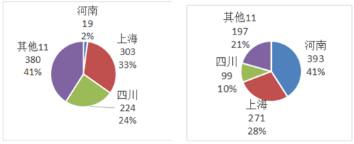 圖15是2019年加工金剛石進口省市分布。由圖15可知,計有14個省市進口該產品。進口總量927公斤,總額960萬美元。前3名占進口量的59%,占進口額的79%;其他11個省市分別占41%、21%;上海進口量最大,占總量的33%;河南進口額最大,占總額的41%。平均進口單價是10.4$/g;最高的是河南,204.1$/g;最低的是四川,4.4$/g。最高最低單價差46倍多,具體產品差異巨大。