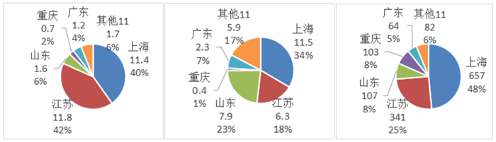 (a)數量分布(單位:噸) (b)數量分布(單位:萬件) (c)金額分布(單位:萬美元)