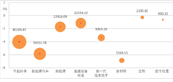 圖1 戰新產業大類營業收入情況及同比增速分布(%、億元)