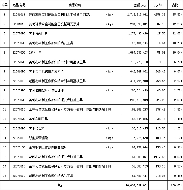 4. 刀具進口主要品種:刀片(46.56億人民幣)、銑刀(12.77億人民幣)、鉆頭(11.46億人民幣)、攻絲工具(10.67億人民幣)、互換工具(7.2億人民幣)、超硬互換工具(3.18億人民幣)、鏜鉸刀(2.85億人民幣)、帶鋸條(1.19億人民幣)。