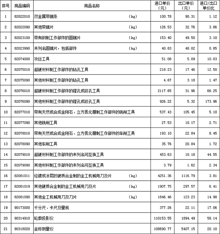 3)附表中,在計算產品單價時,圓鋸片、刀片、帶鋸條的單位采用公斤(kg,其它類產品以件為單位。
