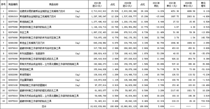 中國機床工具工業協會工具分會秘書處收集和整理了2021年工具(刀具、量具、量儀)進出口海關數據,并進行了計算和分析,供行業參考。