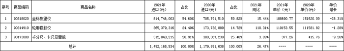 2021年量具和量儀進口額(表914.92億人民幣,同比2020年增長26.47%,與2019年同比增長11.73%。其中,量具進口3.12億人民幣,同比2020年增長3.89%,量儀(坐標測量儀、輪廓投影儀)進口11.8億人民幣,同比2020年增長34.18%