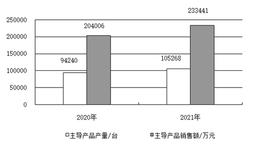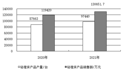 2021年行業主導產品中鉆鏜床產品的產量占比92.56%,圖4是近兩年鉆鏜床產品的產量和銷售額情況,可以看出,2021年鉆鏜床產品產量同比增長11.15%、銷售總額同比增長9.4%。
