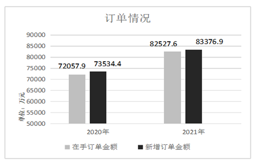根據14家鉆鏜床行業重點骨干企業統計數據,截至2021年12月,鉆鏜床行業訂單同比情況見圖5。2020年在手訂單72057.9萬元,2021年在手訂單82527.6萬元,在手訂單同比增長14.53%;2020年新增訂單73534.4萬元,2021年新增訂單83376.9萬元,新增訂單同比增長13.38%。從訂單情況來看,同比增幅總體上比較顯著,呈現出市場需求轉旺跡象。