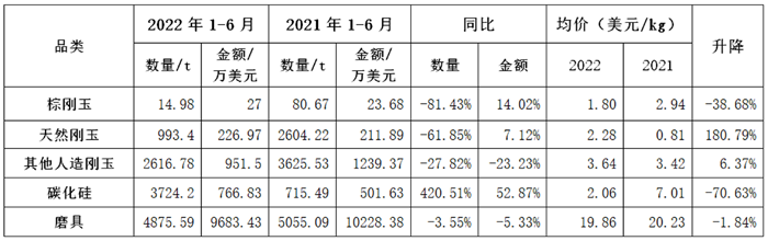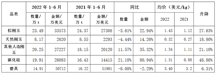 2022年上半年磨料磨具行業各主要產品出口量價見表1