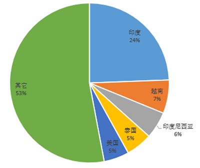 2022上半年,棕剛玉、其他人造剛玉、碳化硅、磨具產品主要出口國家和地區如圖1-4所示。