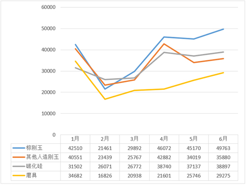 從圖5中可以看到,磨料產品的升降趨勢基本一致,2月是行業傳統淡季,自3月開始各類產品的出口量開始攀升,至5月因疫情原因出現回調后,在6月再度企穩回升。磨具產品增長變化則較為平緩,且較2021年同期相比各月出口量均有下降。