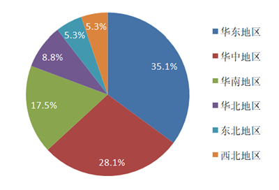 從行業(yè)上市公司的地區(qū)分布來看,華東地區(qū)居首,占35.1%;華中地區(qū)其次,占28.1%;華南地區(qū)第三,為17.5%。具體分布情況如圖1所示。