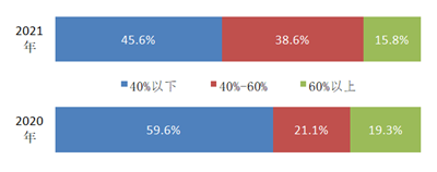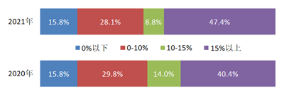 從利潤率的分布來看,2021年度利潤率在0%以下的企業(yè)占比為15.8%,與上年同期保持持平;位于0%-10%之間的占比為28.1%,同比下降1.8個百分點;位于10%-15%之間的占比為8.8%,同比下降5.3個百分點;位于15%以上的占比為47.4%,同比上升7個百分點。整體分布略往15%以上區(qū)域集中。利潤率的整體分布情況見圖4。
