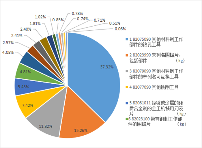 鉆頭(65.25億元),圓鋸片(35.08億元),互換工具(20.66億元),刀片(15.25億元),銑刀(12.98億元),攻絲工具(7.13億元),超硬互換工具(4.21億元),超硬孔加工刀具(4.2億元),帶鋸條(3.17億元)。