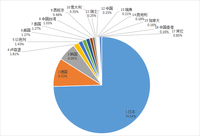 非涂層刀片進口來源地主要為:日本74.54%;德國9.53%;韓國6.09%;盧森堡1.81%;以色列1.4%;美國1.27%;泰國1.27%。