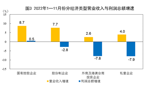 111月份,規模以上工業企業中,國有控股企業實現利潤總額24049.7億元,同比增長0.5%;股份制企業實現利潤總額56412.0億元,下降2.8%;外商及港澳臺商投資企業實現利潤總額18378.5億元,下降7.8%;私營企業實現利潤總額22636.9億元,下降7.9%