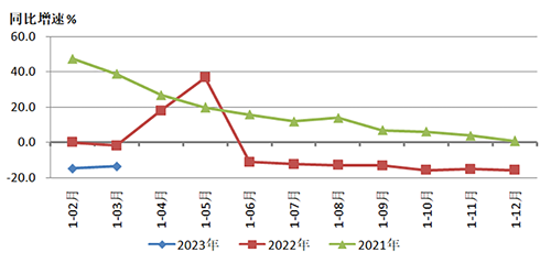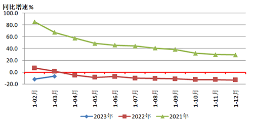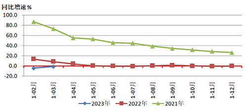 圖1是2023年1-3月和2022年、2021年重點聯系企業營業收入同比增速情況的對比。