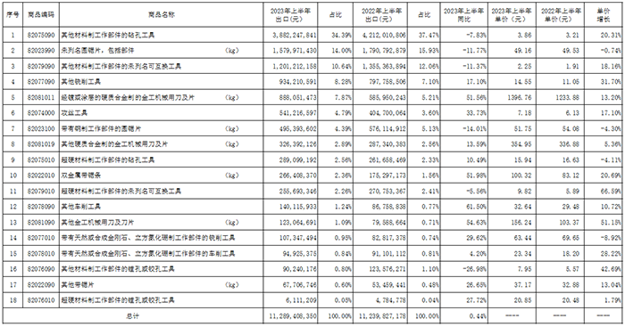 中國機床工具工業(yè)協(xié)會工具分會秘書處收集整理了2023年上半年工具(刀具、量具、量儀)進出口海關(guān)數(shù)據(jù),并進行了計算和分析,供行業(yè)參考。