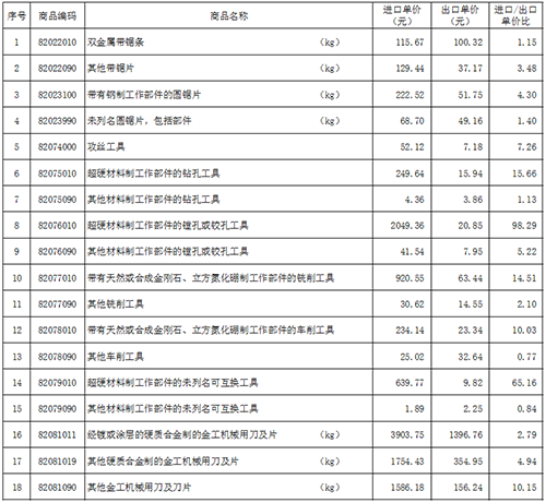 附表中,在計算產(chǎn)品單價時,圓鋸片、刀片、帶鋸條的單位采用公斤(kg),其它類產(chǎn)品以件為單位。