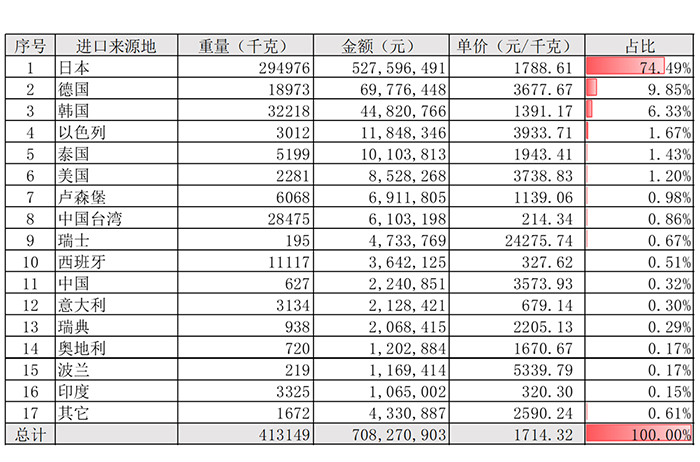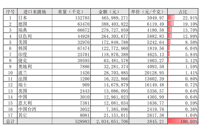 表1 2023年1-9月經鍍或涂層的硬質合金制的金工機械用刀及片(82081011)進口來源地統計