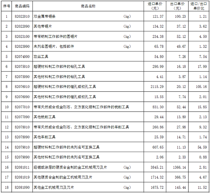 海關數據是根據海關進出口商品編碼進行分類,與行業習慣分類不完全一致。表中所列的產品可能未完全包括所有的工具產品,也可能包括了不屬于工具行業的產品。附表中,在計算產品單價時,圓鋸片,刀片,帶鋸條的單位采用公斤(kg),其它類產品以件為單位。