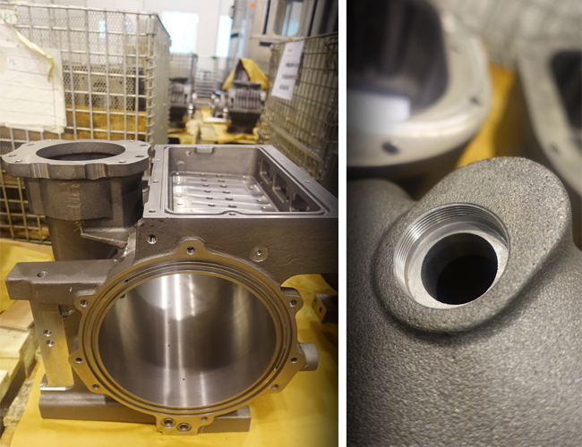 20153月,正值萊寶SV630項目上線,需要進行泵體泵腔內孔精鏜加工,根據工件材料、硬度、長徑比等具體情況,山高設計了非標減震鏜桿及非標刀體配標準精鏜單元。同年7月到貨后,山高的天津技術支持洪溪達密切跟蹤試切,選用不同切削參數,但還是仍然不能達到技術要求,內孔表面有明顯震紋。經過現場分析排查,初步推斷可能是以下幾個問題:機床主軸問題,刀片槽型刃口選型不對,減震鏜桿有問題;有著豐富加工經驗的王春利工程師認為是刀具前部的非標刀體及精鏜單元剛性不足,需重新設計。此時,山高天津團隊做了兩手準備,一方面,聯系上海的設計工程師赴萊寶現場進行技術支持,另一方面請求法國設計部排查刀具設計問題。王工提出新的非標刀體及精鏜模塊方案,在設計部門的積極努力下,新刀體終于完成。現場試切,一次成功,內孔粗糙度達Ra1.6,一刀孔徑變化在0.01mm內。