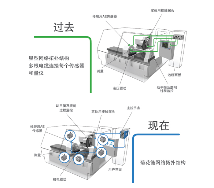 在磨削領(lǐng)域除了磨削在線量儀及砂輪在線平衡系統(tǒng)、AE磨削過程監(jiān)控系統(tǒng)以外,馬波斯展出了最新的產(chǎn)品BLú,這是馬波斯在磨床及其他機床的過程優(yōu)化管理應(yīng)用中50多年經(jīng)驗的結(jié)晶。BLú由一系列功能節(jié)點組成,通過由主控節(jié)點控制的單一總線,所有節(jié)點互相連接,從而形成一個獨立網(wǎng)絡(luò)。按照不同的控制功能要求,單獨的功能節(jié)點被設(shè)定為輔助節(jié)點,用來控制以下功能:附加的物理I/O、測量頭測桿收張、用于定位的馬達、更換不同的控制系統(tǒng)、讀取數(shù)字傳感器信號,等等。