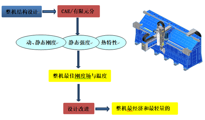 對整機結構進行CAE有限元分析,結合動、靜態剛度,靜態強度,熱特性進行分析,得到整機最佳的剛度場與溫度場,經過反復測試及驗證,進行設計改進,分析理論值與實際測試值數據的差異化的因素,當理論值與實際測試值數據基本吻合,最終獲得整機既經濟又輕量的結構設計。機床結構優化設計及動態設計方框圖與機床結構圖如圖2所示。