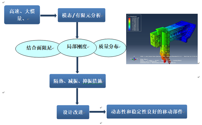 對高速度、大慣量、大尺寸的部件進行CAE有限元模態分析,對結合面阻尼、局部剛度、質量分布進行分析,采取隔振、減振、抑振措施,對結構進行設計改進及優化,經過反復測試驗證,獲取動態性能和穩定性良好的移動部件,確保產品的動態性能與穩定性。提高動態性能和穩定性方框圖與模態分析圖分別如圖3 、圖4所示。