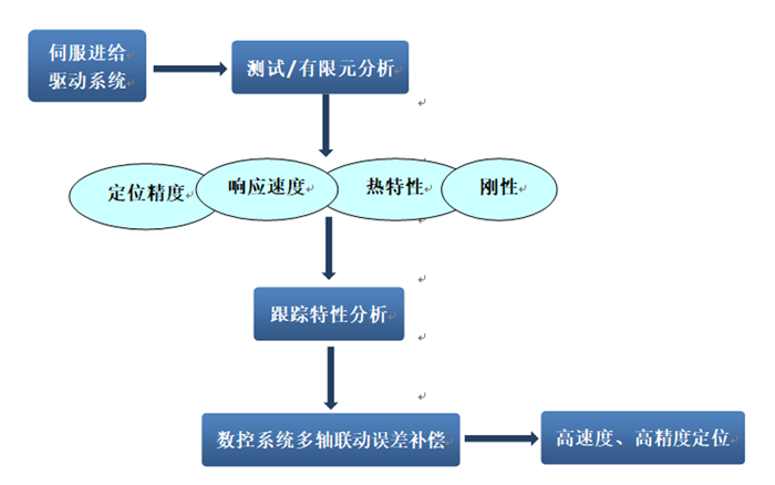 對電機及伺服進給驅動系統進行測試及有限元分析,結合定位精度、響應速度、熱特性、電機剛性進行分析及優化,并跟蹤特性分析,對數控系統多軸聯動進行誤差補償,獲得高速度,高精度定位。伺服驅動系統分析方框圖如圖5所示。