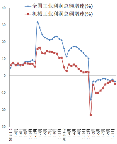 (3)經(jīng)濟(jì)效益指標(biāo)下滑:2019年機(jī)械工業(yè)累計(jì)實(shí)現(xiàn)營業(yè)收入21.76萬億元,同比增長2.46%,全年持續(xù)低速增長,增速較全國工業(yè)低1.39個(gè)百分點(diǎn);實(shí)現(xiàn)利潤總額1.32萬億元,同比下降4.53%,全年持續(xù)負(fù)增長,增速較全國工業(yè)低1.24個(gè)百分點(diǎn)。