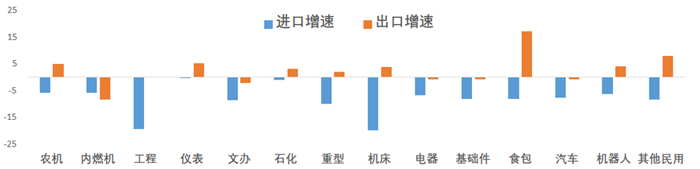 (5)中美間貿(mào)易受影響:美國三次加稅清單(共計(jì)5500億美元)涉及機(jī)械工業(yè)稅號(hào)已占機(jī)械工業(yè)全部稅號(hào)的98%。受此影響,2019年機(jī)械工業(yè)對(duì)美貿(mào)易顯著下滑。全年累計(jì)自美進(jìn)口325億美元,同比下降10.73%,降幅較機(jī)械工業(yè)平均水平低4.23個(gè)百分點(diǎn);對(duì)美出口698億美元,同比下降16.59%,降幅較機(jī)械工業(yè)平均水平低17.81個(gè)百分點(diǎn)。貿(mào)易摩擦對(duì)中美機(jī)械工業(yè)貿(mào)易已產(chǎn)生較大影響。