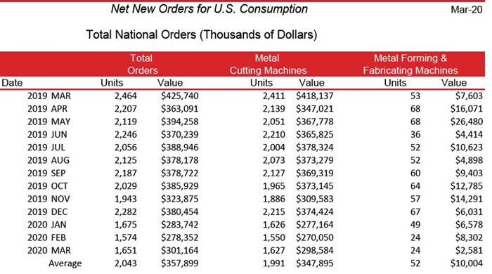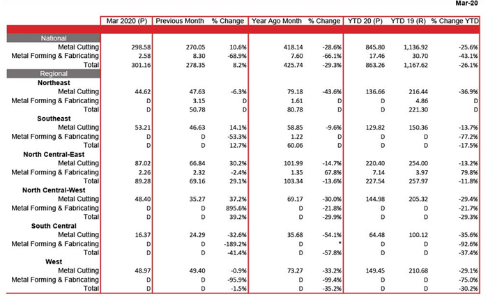 美國(guó)機(jī)械制造技術(shù)協(xié)會(huì)(AMT)5月11日發(fā)布的最新《美國(guó)制造技術(shù)訂單》報(bào)告顯示,3月份美國(guó)制造技術(shù)相關(guān)訂單較上月增長(zhǎng)8%,至3.012億美元。較去年同期減少29.3%。2020年第一季度總訂單額為8.63億美元,比去年同期下降26.1%。
