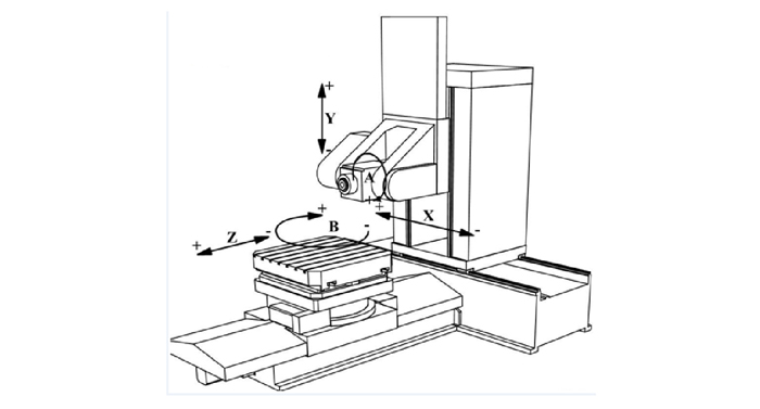 機床各進給軸電機全部采用交流伺服電機,可實現5軸聯動插補、刀具補償、絲桿螺距誤差補償和測量系統誤差補償等功能。機床XYZAB采用全閉環控制,提高機床加工精度。機床總體結構及各軸示意如下圖所示。