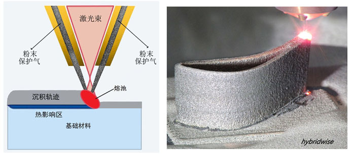 左圖-激光送粉的直接能量沉積原理圖 右圖-激光送粉沉積空心葉片