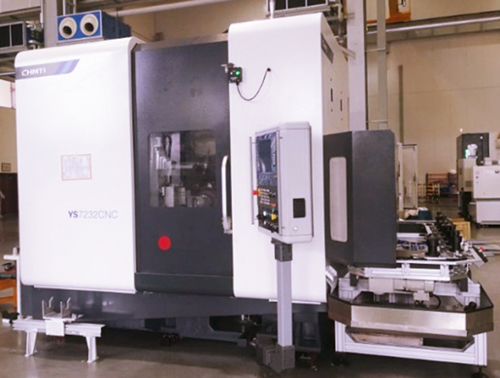 該機為8軸4軸聯動數控干切滾齒機,配置有料倉及自動化電氣接口,能實現單機及聯機自動化生產。機床結構緊湊,占地面積僅7平方米,操作方便、快捷。機床刀具主軸和工作臺主軸均采用內裝電機直接驅動的結構,傳動鏈短、剛性好,適合高速、高效、高精度切削。對于中小模數齒輪采用330m/min超高速加工,精度全面達到GB/T10095.1-2008的6級。機床特別適用于乘用車變速器齒輪、特別是電動車齒輪及轉向器齒輪加工。