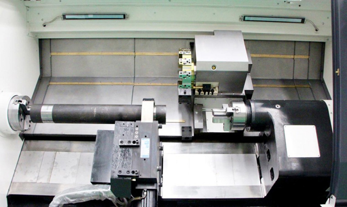 該機床具有雙主軸結構,主軸轉速2000r/min,配備12工位臥式伺服動力刀塔,可銑削外圓、端面、鍵槽,鉆削徑向、軸向及進行螺紋加工。機床采用45°后置斜床身,操作、調整方便,受力狀態好,利于排屑。機床橫、縱向導軌采用高精度重載荷淬火貼塑導軌副,大大提高機床剛性和穩定性,延長機床使用壽命。