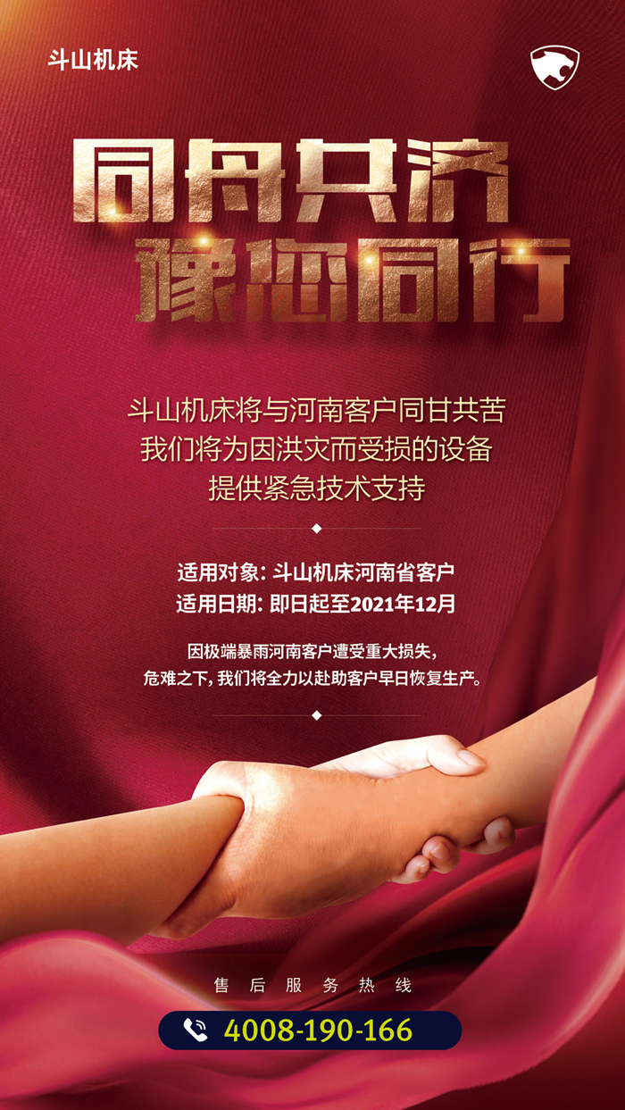 寧波海天精工股份有限公司為受災(zāi)的河南客戶提供如下支持:(1)免費(fèi)為受災(zāi)客戶提供清理維修服務(wù);(2)受災(zāi)損壞的零配件按照采購(gòu)成本價(jià)供應(yīng);(3)組織了專業(yè)救災(zāi)隊(duì)伍隨時(shí)等候客戶的召喚。海天精工服務(wù)熱線:4009262116。