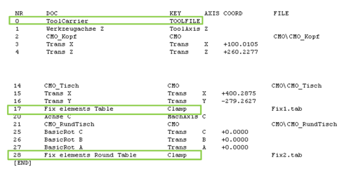 ②建立夾具以及刀柄實(shí)體。同樣是使用Kinematics Design軟件對(duì)常用夾具以及刀柄進(jìn)行描述定義,并將生成的模板文件拷貝到數(shù)控系統(tǒng)TNC分區(qū)的根目錄下。為了生效夾具以及刀柄,必須在Kinematics Table中擴(kuò)展定義TOOLFILE以及Clamp,如圖3所示。