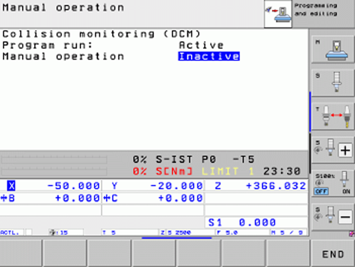 ③DCM功能使用方法。完成以上配置后,可在海德漢iTNC530數(shù)控系統(tǒng)上使用DCM功能。在手動(dòng)操作菜單項(xiàng)中,進(jìn)入COLLISION界面,可分別在程序運(yùn)行和手動(dòng)操作狀態(tài)下打開或關(guān)閉DCM功能,如圖4所示。