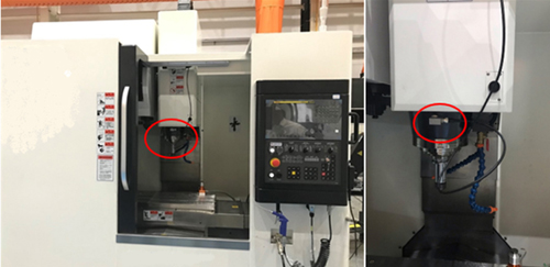 以一臺(tái)三軸立式加工中心為例,在機(jī)床主軸端安裝振動(dòng)傳感器,如圖9所示,越接近主軸鼻端效果越佳。通過振動(dòng)傳感器進(jìn)行數(shù)控機(jī)床碰撞識(shí)別,通常振動(dòng)加速度≥30m/s2時(shí),判斷為碰撞事件,同時(shí)監(jiān)控模塊在3ms內(nèi)發(fā)出報(bào)警信號(hào),給機(jī)床控制系統(tǒng)觸發(fā)急停報(bào)警,機(jī)床快速停止,如圖10所示,將碰撞造成的損壞降到最低。