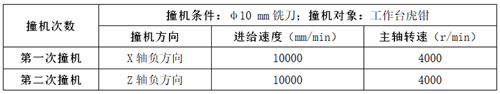 ①試驗(yàn)條件:一臺(tái)三軸立式加工中心,配置FANUC 0I數(shù)控系統(tǒng),以G00速度(最大移動(dòng)速度)分別從X和Z方向進(jìn)行兩次撞機(jī)測試(具體條件如表1所示),測量撞機(jī)前后主軸靜態(tài)和動(dòng)態(tài)精度差異,用以驗(yàn)證碰撞保護(hù)功能效果。
