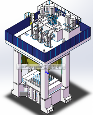 該設備是汽車結構件熱沖壓技術和裝備生產線中的關鍵裝備,是實現汽車輕量化的方式之一。產線中26000kN高速熱成形液壓機主機機身采用分體預緊框架結構,由上橫梁、下橫梁、立柱、四根拉桿及拉桿螺母等組成,上橫梁、下橫梁、四立柱通過拉桿經超壓預緊。為方便更換模具,配有前移式移動工作臺。壓力、位置、時間參數均實現數控,具有速度快、精度高、柔性生產的特點。
