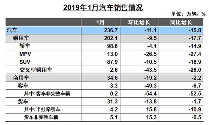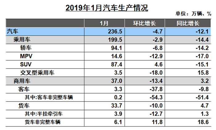 中國汽車工業(yè)協(xié)會(huì)統(tǒng)計(jì)信息顯示,2019年1月,我國汽車產(chǎn)銷比上月均呈下降,商用車降幅更為明顯;與上年同期相比,汽車產(chǎn)銷呈較快下降,乘用車降幅高于行業(yè)。