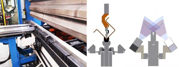 (1)通過激光在線檢測工件回彈后的折彎角度;(2)受力檢測系統(tǒng)自動計算折彎回彈量;(3)件根據(jù)下模寬度的不同可自動調整進深;(4)通過閉環(huán)的激光角度在線測量系統(tǒng),保證折彎成品率達到99.5%以上。