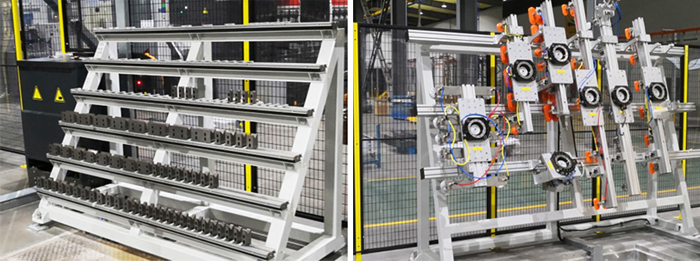 機器人自動(ATC)換抓手(見圖8)、換模是鈑金領域完全的智能自動化操作方式,該方式由自動換模軟件、機器人和模具庫(見圖9)組成。當選配自動換模系統(tǒng)時,精密折彎中心從此可以全自動隨機折彎小批次的不同產(chǎn)品。利用自動更換模具的功能,折彎機中的模具不再成為限制因素,可全程無人處理部件。機器人自動機械裝置的抓手更換模具的速度非???,隨時可折彎下批部件。
