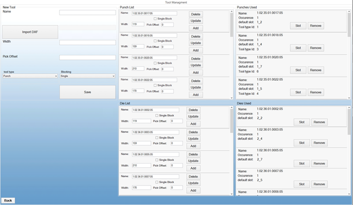 (1)通過附件的圖形化界面,用戶能夠立即看到整個系統(tǒng)的現(xiàn)狀;在該界面的右邊,有一個圖形表示模具的狀態(tài),對這些模具當前的位置進行分區(qū)。(2)整個界面包括折彎上模區(qū)域、折彎下模區(qū)域和模具庫;模具的展示遵循模具本身的尺寸,被夾持的工位位置。(3)上下模用不同顏色區(qū)分;在該界面的左上邊,有對折彎機上所裝模具的詳細描述。兩個部分:一個是解釋上模,一個是解釋下模,通過識別碼和現(xiàn)有位置來描述被夾持的模具。