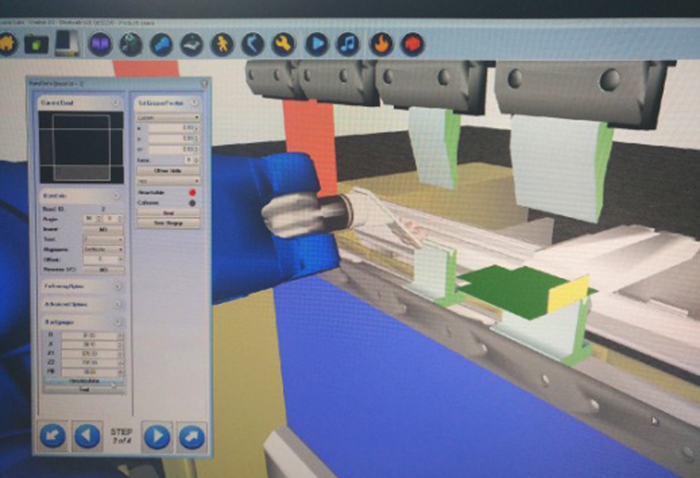 在機器人折彎單元中我們應用了參數(shù)化編程軟件、離線編程軟件(見圖12)和生產(chǎn)管理軟件,同時二次開發(fā)了折彎隨動、自動換模、自動換抓手、柔性碼垛、實時補償、板邊尋邊、柔性翻轉技術和總線控制技術??蓸O大地滿足各類客戶鈑金折彎的技術和軟件需求。
