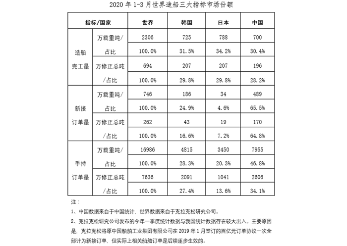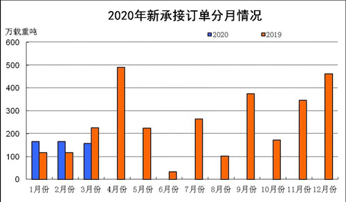 2020年1-3月份,受全球新冠肺炎疫情蔓延的影響,國際航運市場持續低迷。我國造船完工量和手持船舶訂單量同比下降,受去年同期基數較低的影響,我國新承接船舶訂單小幅增長。重點監測企業工業總產值等主要經濟指標持續下降。
